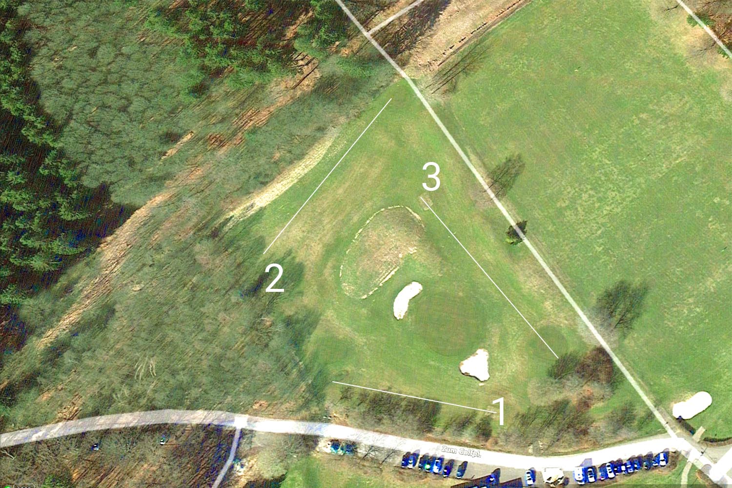 In der Mitte der 3 Übungsbahnen ist ein Pitchareal mit Bunker zu finden.