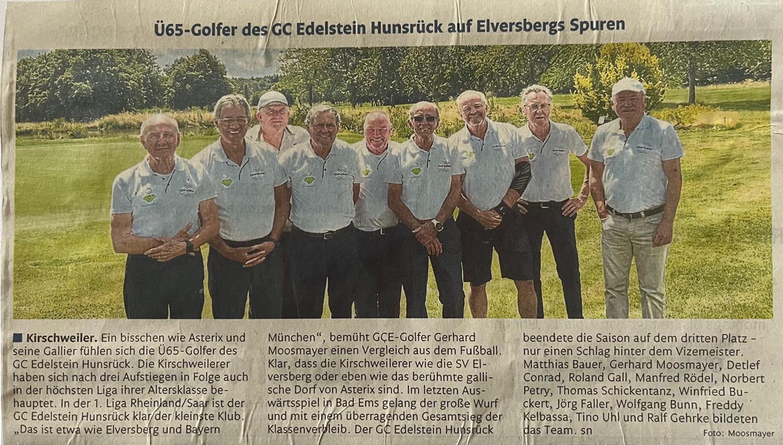 Mit einen zweiten Platz im letzten Spiel beim GC Rhein-Wied sichert sich die AK 65 Herren-Mannschaft des GC Edelstein zum dritten Mal in Folge den Aufstieg. Als Sieger der 2. Liga Nord geht es 2025 in die 1. Liga Rheinland-Pfalz-Saarland. Das war nur durch die tolle Leistung des gesamten Teams, an der jeder seinen Anteil hat, möglich.